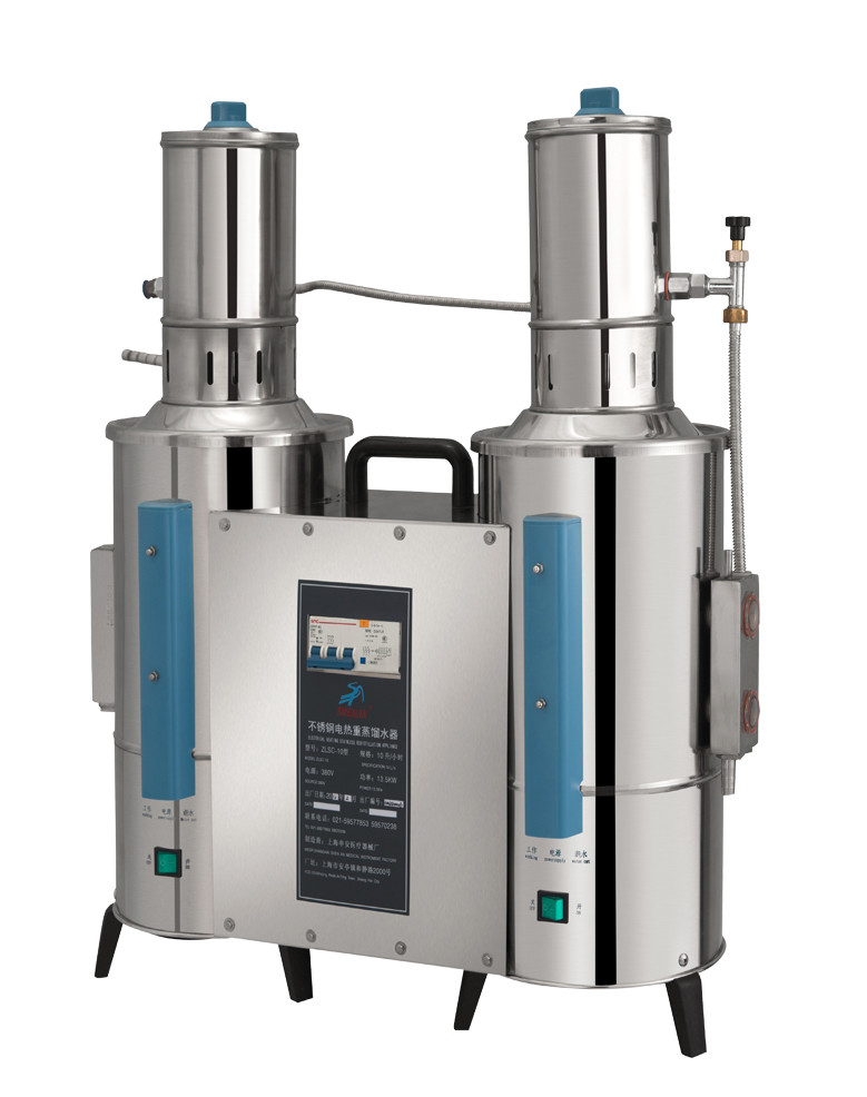 不銹鋼電熱重蒸餾水器產品型號 ZLSC-20將蒸汽進行冷熱交換是目前提取優質純蒸餾水的可靠方法,本廠生產的不銹鋼蒸餾水器是新一代升級換代產品,可二次蒸餾。本器設計合理、操作簡便、使用安全,控制部分采用內置分流式結構,解決了老式蒸餾水器的操作性能差、易翻水、冒水等缺陷。本系列產品選用優質不銹鋼材料精制而成,水質符合國家藥典(2000版